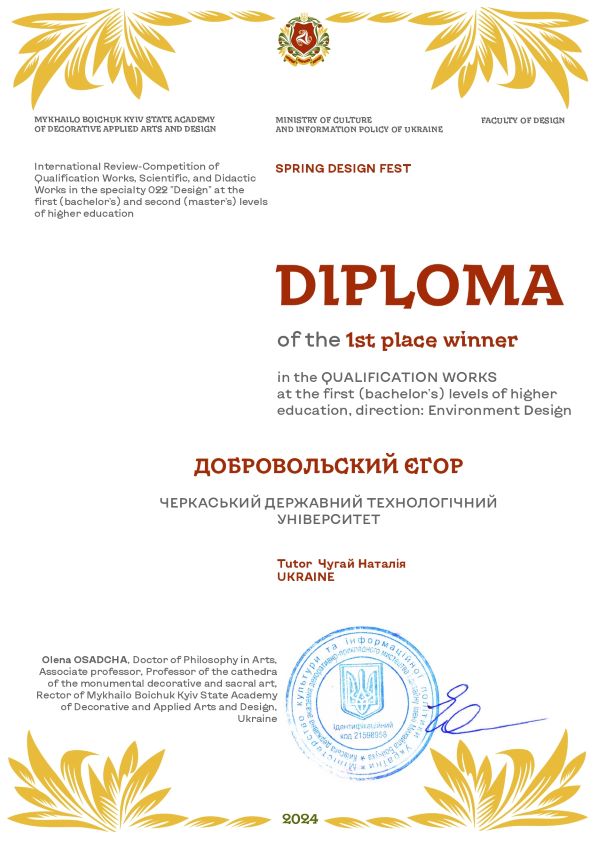 Упродовж квітня-травня 2024 року Київська державна академія декоративно-прикладного мистецтва і дизайну імені Михайла Бойчука провела міжнародний огляд-конкурс кваліфікаційних робіт, наукових та дидактичних праць зі спеціальності 022 «Дизайн» за першим (бакалаврським) та другим (магістерським) рівнями вищої освіти. Кафедра дизайну Черкаського державного технологічного університету взяла активну участь у конкурсі, представивши на розгляд експертної комісії 9 робіт, які отримали позитивні відгуки й високі оцінки експертів.