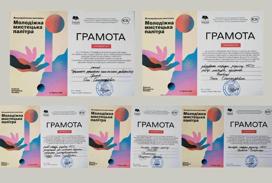 Враженнями від задуму до реалізації виставки поділилися незмінний арткуратор «Молодіжної мистецької палітри» – черкаський художник, голова Черкаського відділення молодіжного об’єднання спілки художників України, член Національної спілки художників України Володимир Яковець та голова Черкаського осередку Національної спілки художників України Лариса Шейх-Афоніна, вручивши Грамоти викладачам-наставникам молоді за професійний педагогічний супровід, підготовку та наставництво студентів-учасників Всеукраїнської виставки «Молодіжна мистецька палітра». Окремо організатори події відзначили ректора ЧДТУ Олега Григора Грамотою за сприяння у проведенні всеукраїнської виставки «Молодіжна мистецька палітра», де зазначено, що управлінська позиція, увага до розвитку молодіжної творчості та підтримки культурно-освітніх ініціатив створюють умови для професійного становлення молодих авторів і розвитку освітнього простору України.