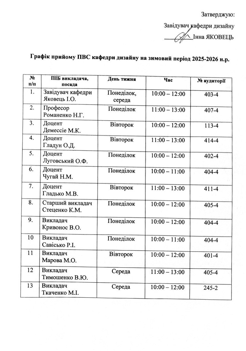 Графік прийому ПВС кафедри дизайну на зимовий період 2025-2026 н.р.